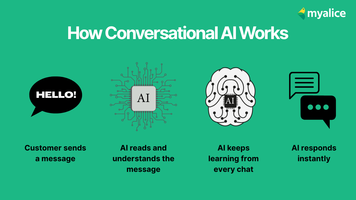 Conversational AI uses natural language processing to understand and respond to customer queries in real time. Unlike chatbots that rely only on rigid scripts, conversational AI learns from every interaction, adapts brand tone and delivers consistent, on-brand replies across multiple channels.